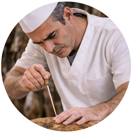En bodega, el jamón se afina, se controla la floración natural y se protege con manteca. Maestros jamoneros realizan calas aromáticas antes de su comercialización final.