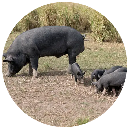 Los cerdos ibéricos viven en libertad en la dehesa, alimentándose de bellotas, pasto y hierbas silvestres. Esta etapa define la calidad final del jamón y la infiltración natural de grasa en la carne.