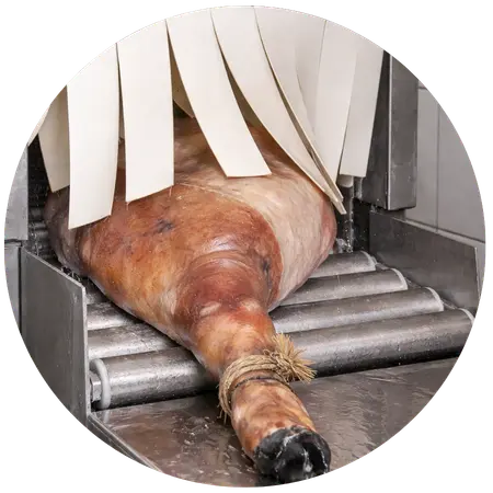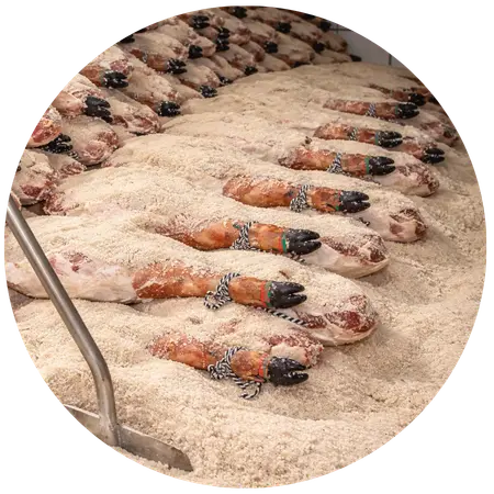 Los cerdos se sacrifican alrededor de los 21 meses de edad. Se seleccionan cuidadosamente las patas traseras, llamadas perniles, destinadas exclusivamente a la elaboración del jamón ibérico.